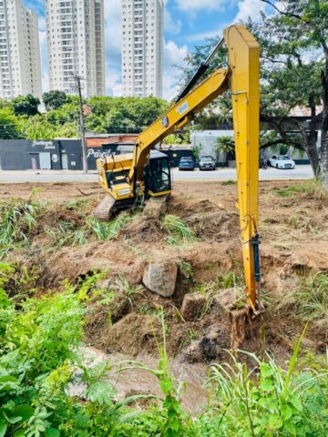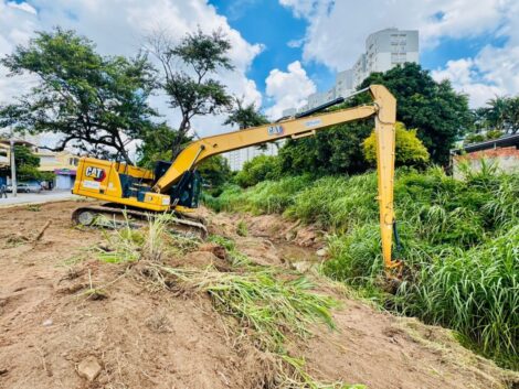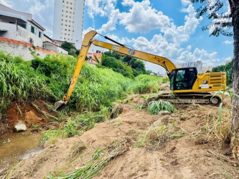A intervenção ocorre periodicamente, ao longo de aproximadamente 300 metros de extensão, com o objetivo de manter o córrego em condições de funcionamento e preparado para suportar os períodos de chuvas.