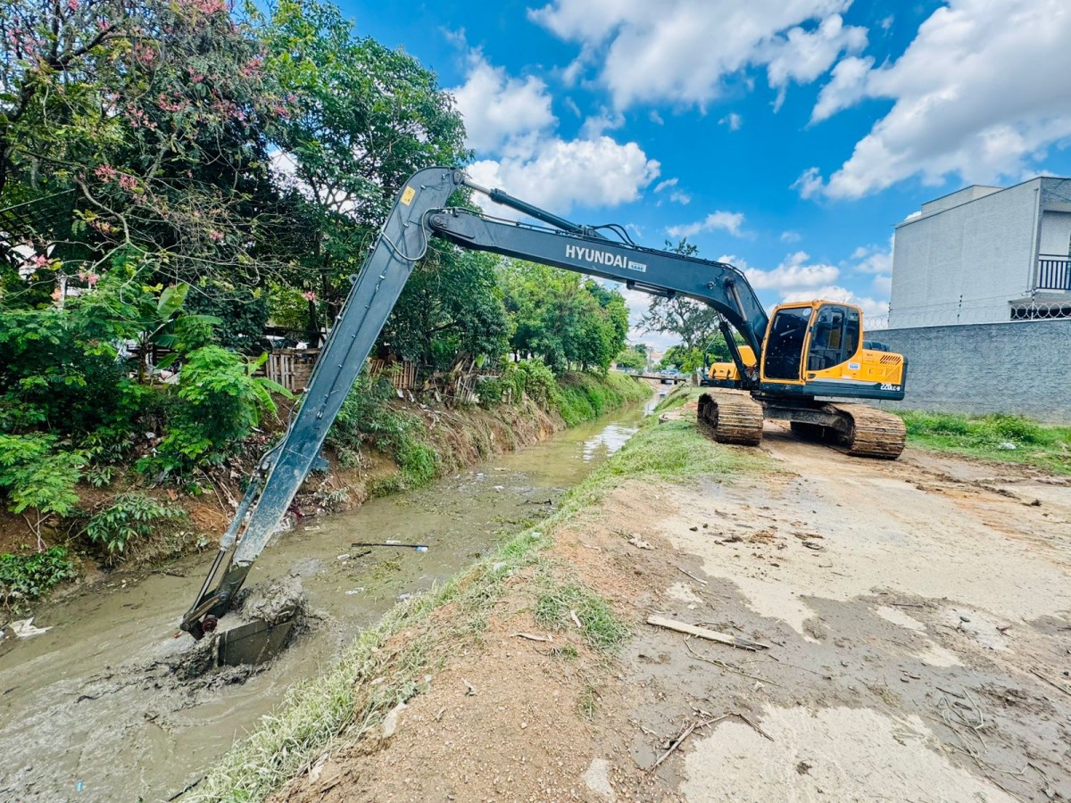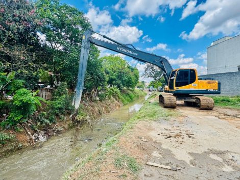 A intervenção ocorre periodicamente, ao longo de aproximadamente 550 metros de extensão, com o objetivo de manter o córrego em condições de funcionamento e preparado para suportar os períodos de chuvas.