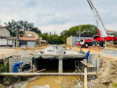Durante a última semana, até esta quarta-feira (8), 106 aduelas de concreto armado, cada uma medindo 3,5 metros de largura por 2,5 metros altura e um metro de comprimento, foram instaladas. Cada peça tem peso aproximado de sete toneladas e a colocação delas ocorreu por meio de escavadeira e guindaste hidráulicos, depois de concluída a preparação da base de sustentação.