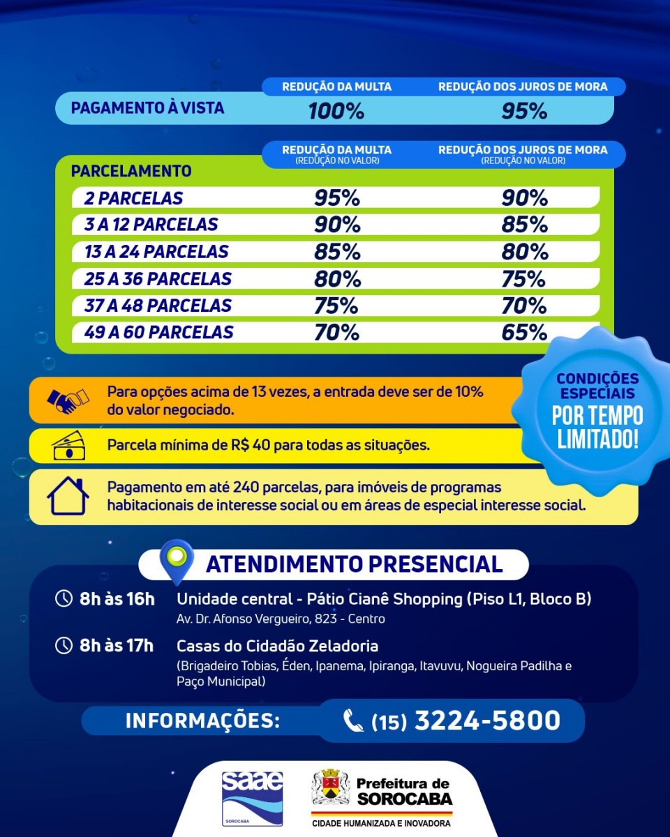 Em relação aos imóveis de programas habitacionais de interesse social ou em áreas declaradas de Especial Interesse Social (Aeis), ou ainda beneficiários da Tarifa Social, será permitido o pagamento em até 240 parcelas, com valor mínimo de R$ 40, por parcela. Para ter acesso a essa opção, é preciso comprovar a carência socioeconômica, pela equipe do Serviço Social do Saae-Sorocaba, sendo, inclusive, vedada a incidência de multa e juros.