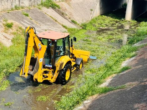 A intervenção ocorre periodicamente, ao longo de aproximadamente 1.100 metros de extensão, com o objetivo de manter o córrego em plenas condições de funcionamento e preparado para suportar os períodos de chuvas.